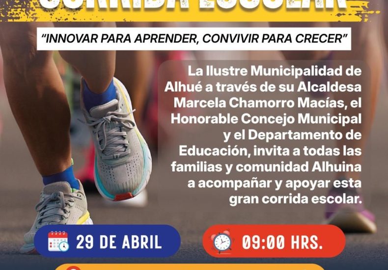 Un entretenido panorama deportivo fue programado para este miércoles 29 de abril. Se trata de la corrida “Innovar para aprender, convivir para crecer”, la cual tendrá como punto de partida, la plaza de Villa Alhué. La actividad, organizada por el Departamento de Educación local, es abierta a la comunidad escolar, donde los padres y apoderados