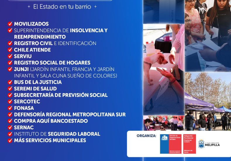 La jornada contará con la participación de servicios como la Superintendencia de Insolvencia y Reemprendimiento para quienes tienen deudas, Registro Civil e Identificación, ChileAtiende, SERVIU con temas de vivienda, Registro Social de Hogares, JUNJI, Bus de la Justicia, Seremi de Salud, Subsecretaría de Previsión Social, SERCOTEC, FONASA, Defensoría Regional Metropolitana Sur, BancoEstado, SERNAC e Instituto de Seguridad Laboral. Además, se sumarán Cruz Roja, equipos de Delegación Provincial de Melipilla y programas municipales.