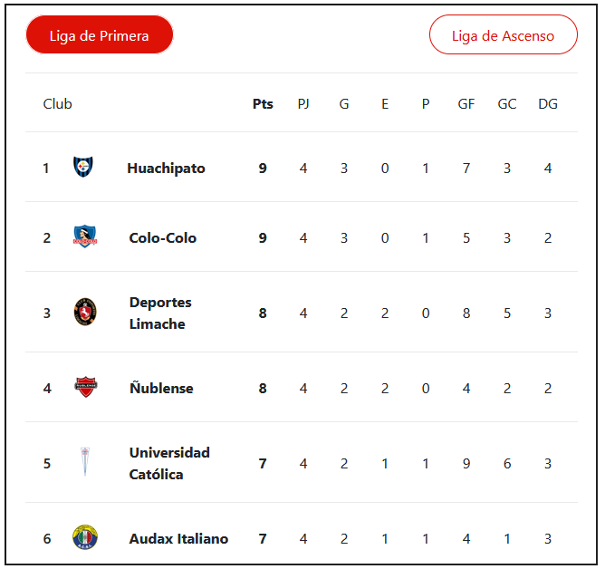 Y tras el primer mes de acciones, Huachipato y Colo Colo se han consolidado como líderes momentáneos del fútbol de honor chileno. Acereros y albos se encuentran igualados con 9 puntos, aunque los sureños más arriba por mejor diferencia de goles.